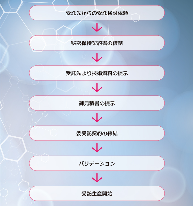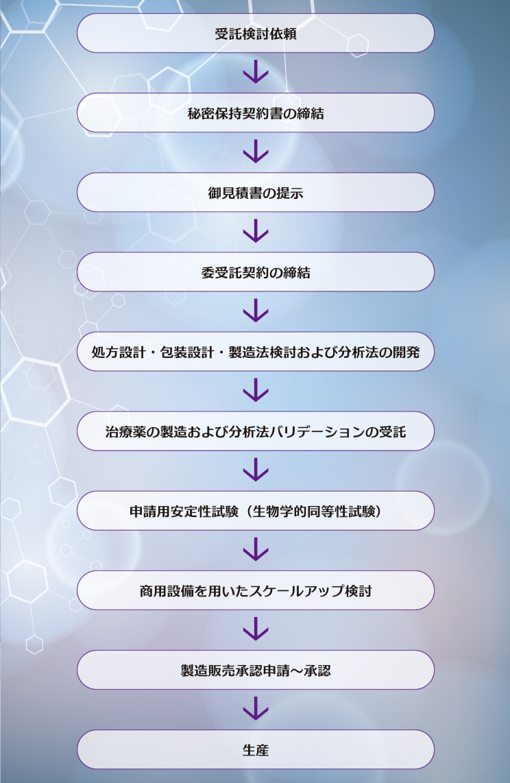 京都薬品工業では、固形製剤の処方設計、分析法の開発、治験薬の製造、包装仕様検討、申請用安定性試験など、CMCに関連した業務の受託を推進しています。 患者さんのQOLの向上やライフ・サイクル・マネジメント(LCM)を念頭においた口腔内崩壊錠の開発など、新製剤・新剤形についての提案を行う提案型受託生産に積極的に取り組んでいます。また、委託元のご要望に基づき、製剤や分析法の改善・改良に取り組む課題解決型受託生産が可能な体制も整えています。 開発された製剤についてはスケールアップ検討から生産まで一貫した受託対応が可能です。